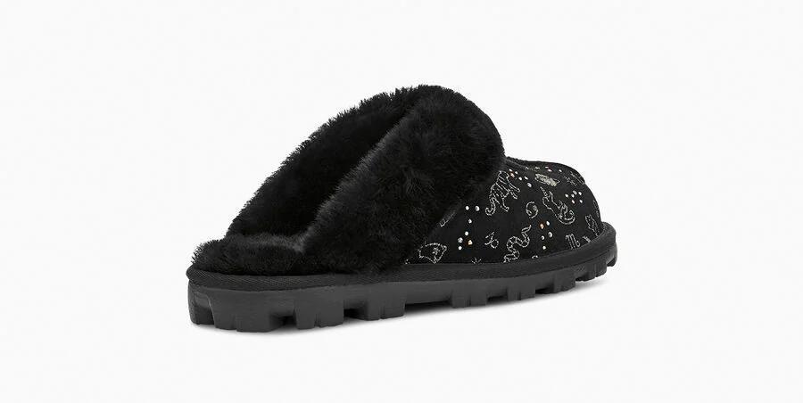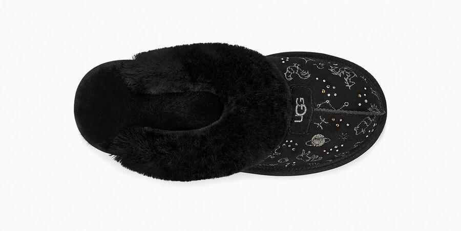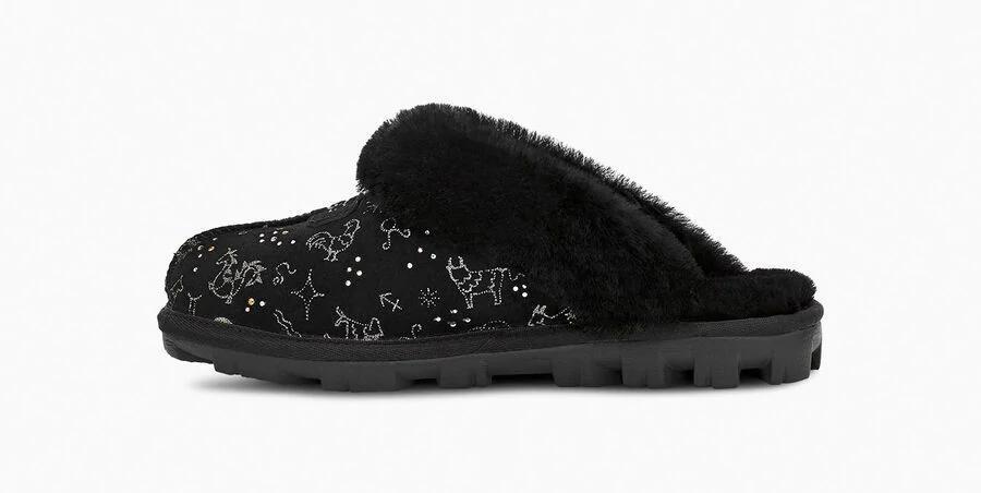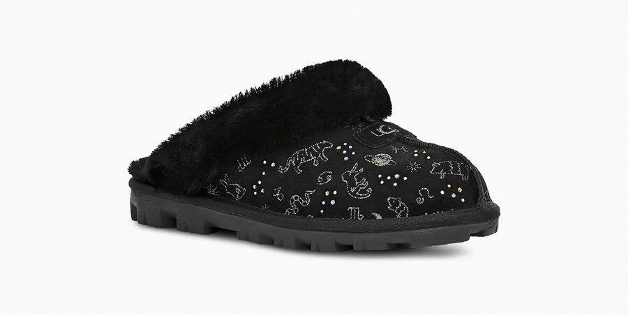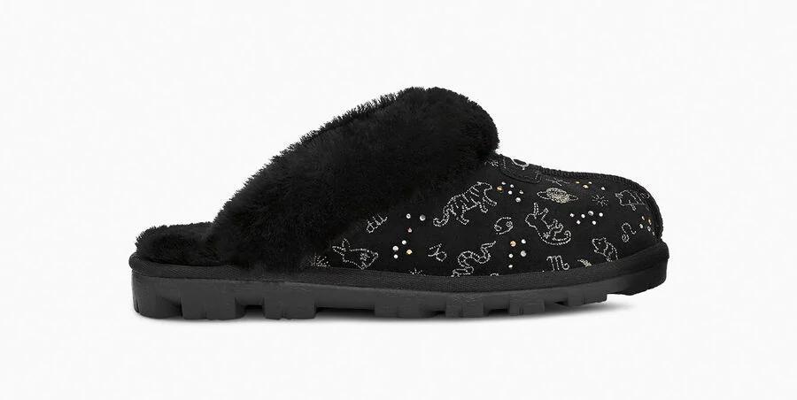 Model:1112305This horoscope-inspired take on our iconic Coquette Slipper features shimmering zodiac signs in a metallic print with dazzling crystal accents. The festive suede upper is grounded on a lightweight, cushioned sole for all-day support, and finished with our ultra-soft sheepskin for cloud-like coziness. Pair with dark denim and velvet, leggings and cashmere, or your favorite robe.