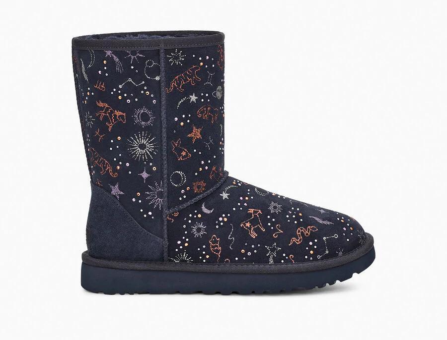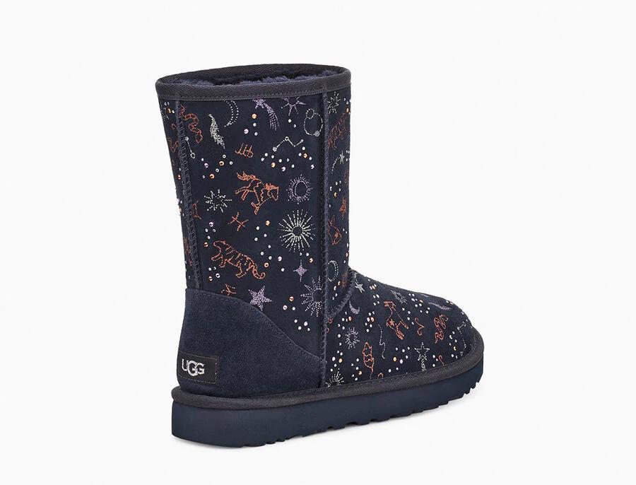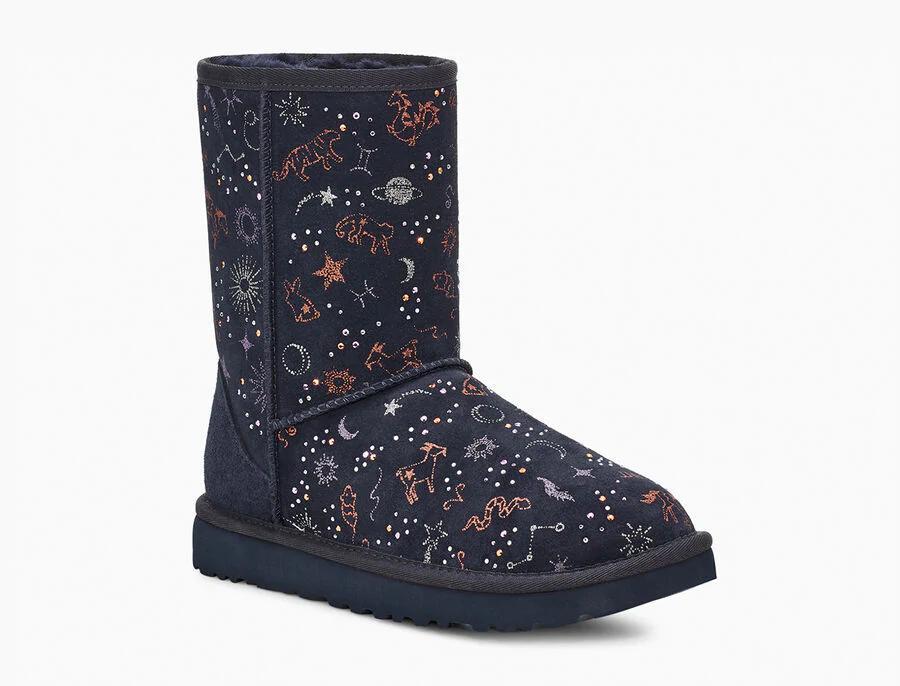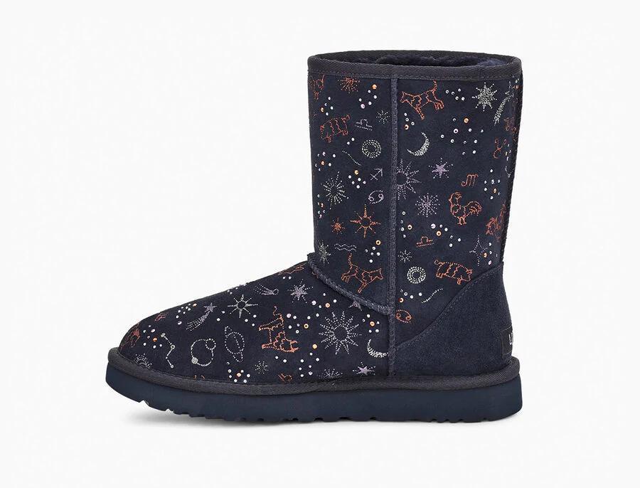 Model:1112517This horoscope-inspired take on our iconic Classic features shimmering zodiac signs in a metallic print with dazzling crystal accents. The festive suede upper is grounded on a lightweight, cushioned sole for all-day support, and finished with our ultra-soft plush wool blend for cloud-like coziness. Pair with dark denim and velvet, or leggings and cashmere.